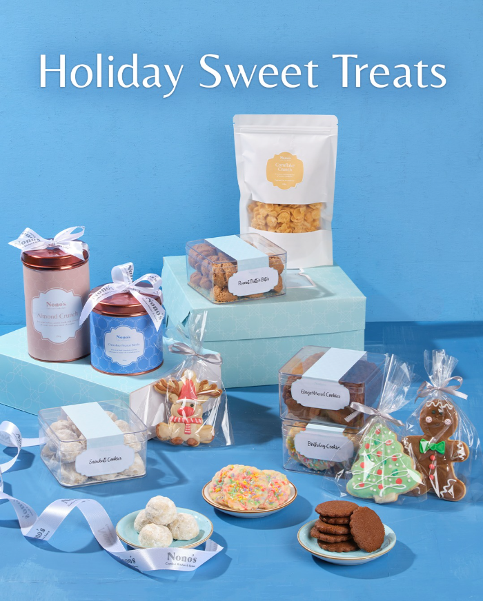 For effortless holiday hosting, Nono’s Comfort Kitchen & Bakery offers generous Party Platters, including comforting mains like the savory Baby Back Ribs with their tangy glaze, the hearty Homestyle Fried Chicken, and the familiar richness of My Mom’s Baked Spaghetti. Beyond dinner, Nono’s Holiday Sweet Treats collection offers perfect gifting options and dessert spreads. These beautifully packaged sweets include the rich, signature Almond Crunch and charming, festive baked goods like the buttery Snowball Cookies.