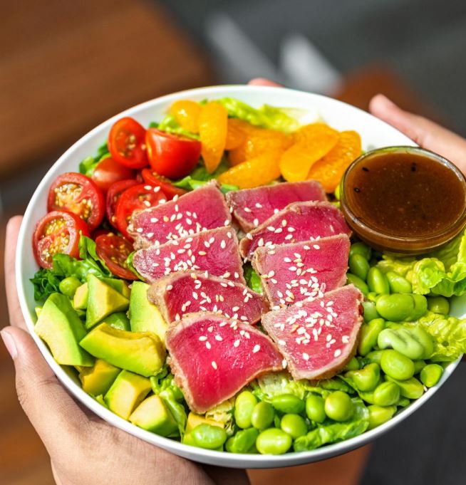 The Hail Caesar classic salad with romaine lettuce, shaved parmesan, cage-free grated eggs, croutons, and bacon bits, dressed with a classic Caesar dressing and Tuna San, Japanese-inspired salad featuring seared tuna, soft-boiled egg, avocado, cherry tomatoes, and edamame, finished with a Wasabi Honey Soy dressing.