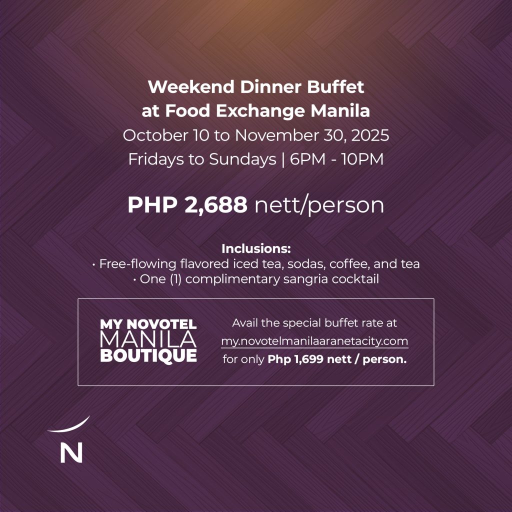 For those looking to add a Spanish twist to their Oktoberfest celebration, Novotel Manila Araneta City invites you to cheer, “Viva España!” with España en tu Mesa: Olé to Spanish Fiesta Feasts at Food Exchange Manila. From October 10 to November 30, enjoy a weekend buffet elevated by the rustic flavors of Spain. Indulge in free-flowing local beers alongside paellas, savory tapas, and decadent desserts. Families are welcome too, with kids aged eight and below dining for free, and special offers available through My Novotel Manila Boutique.